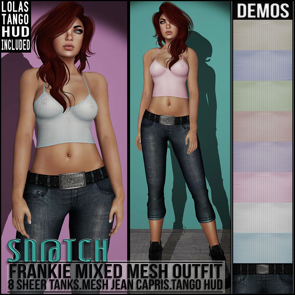 I know SL seems to be all wonky today but we managed to get NEW SPECIALS up at Sn@tch LOL. This cute and simple set of mesh capris and sheer tanks is only $69 L today!